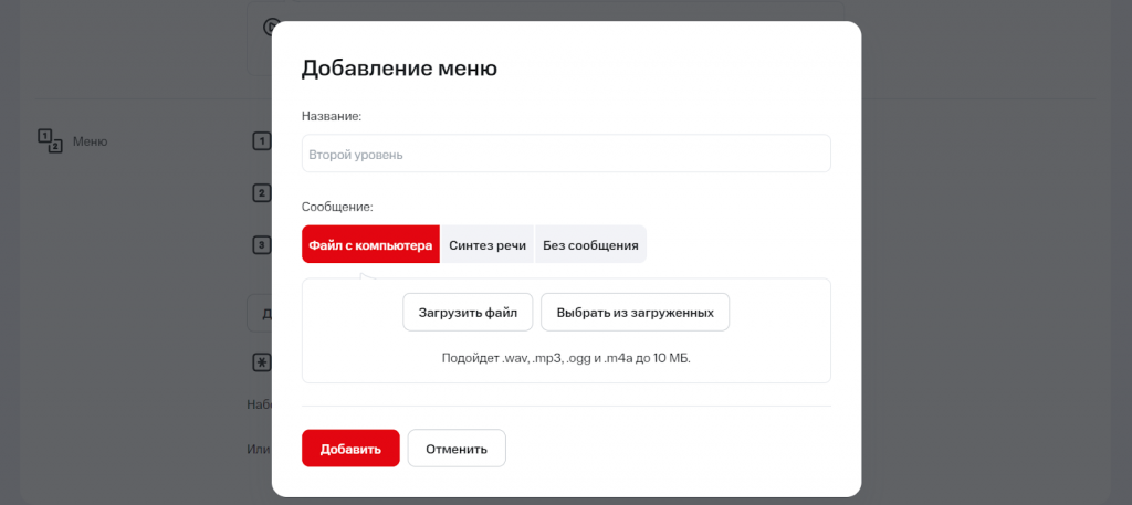 Добавьте голосовое приветствие — загрузите готовый файл или введите текст и озвучьте его через функцию «Синтез речи».