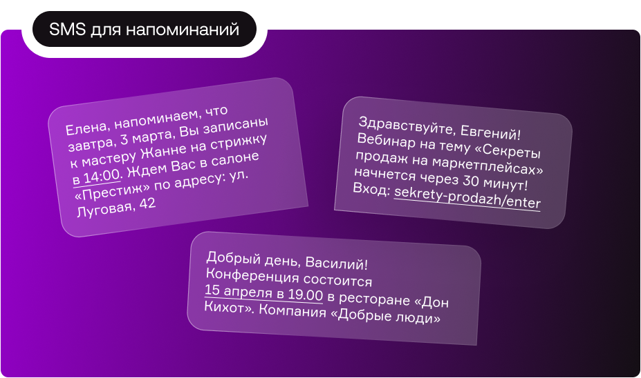 SMS-напоминания можно отнести к категории информационных сообщений. Они подсказывают клиенту, о каком событии ему нужно помнить. Это может быть запись к мастеру маникюра, предстоящий платеж или начало видеоконференции. Для таких уведомлений легко адаптировать шаблонные СМС — персонализировать их, указать основные детали и изменить контактные данные.